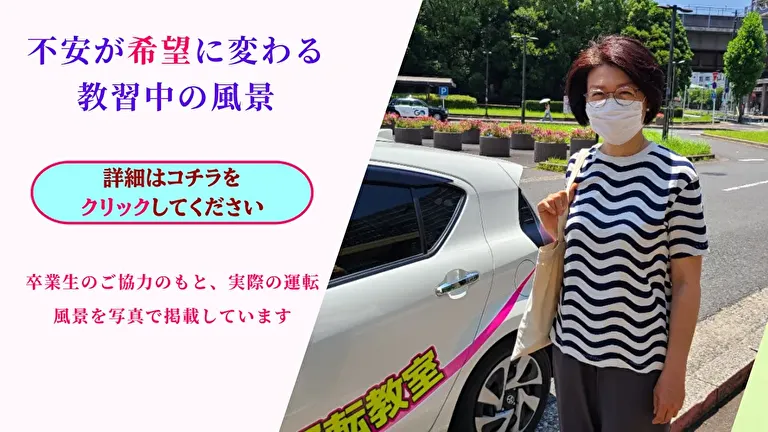 千葉市にお住まいのK様の許可をいただき、顔出しで撮影した教習風景です。K様は30年以上運転経験がありませんでしたが、5回の練習でお一人で運転できる自信を取り戻し、無事に卒業されました。下記の「不安が希望に変わる教習中の風景」をぜひご覧ください。