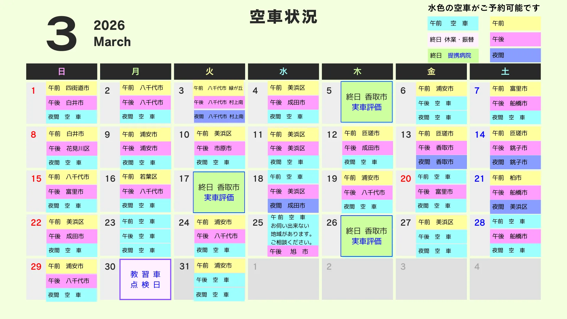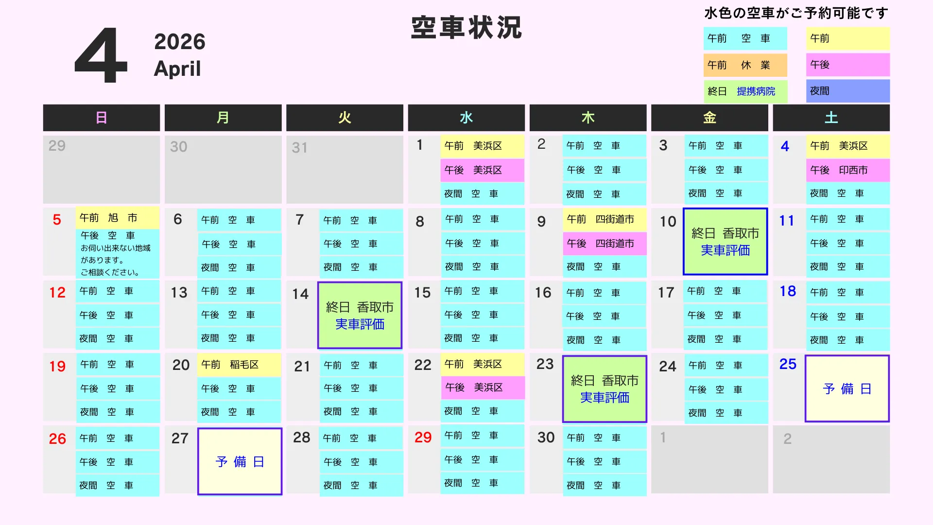 - 下記のカレンダーで水色の空車日時をご確認ください。