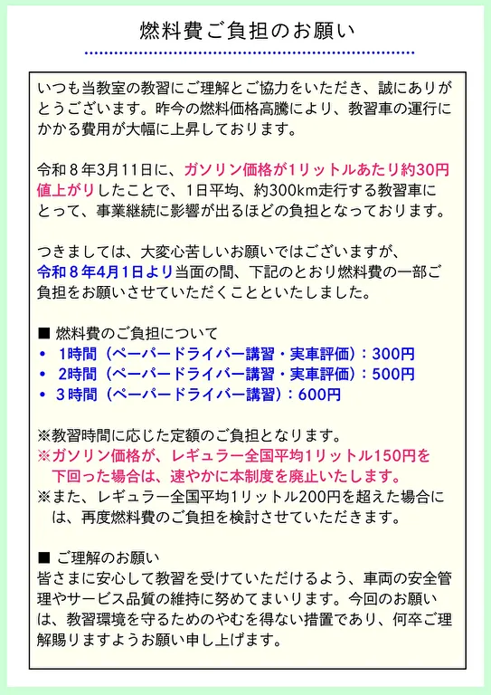 現在、ペーパードライバー講習のお客様が大変多く、初心運転者の方への運転支援を優先しているため、仮免許運転練習の受付を一時停止しております。再開の際は、こちらであらためてご案内いたします。