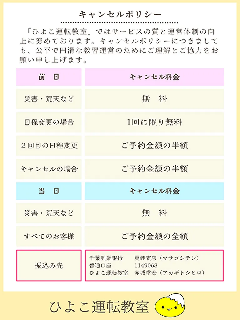 ペーパードライバー講習のご予約に関するキャンセル料を以下の通り定めております。なお、ご予約日の2日前までであれば、キャンセル料は発生いたしません。