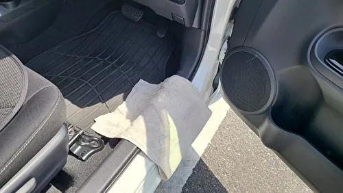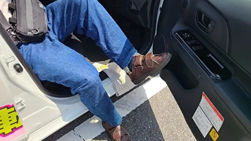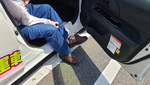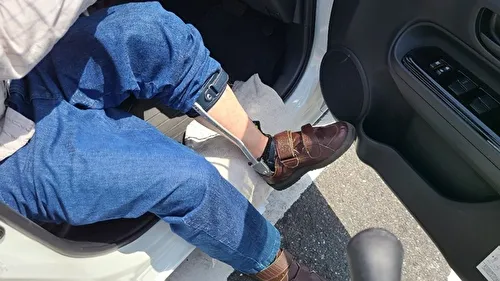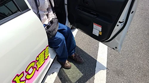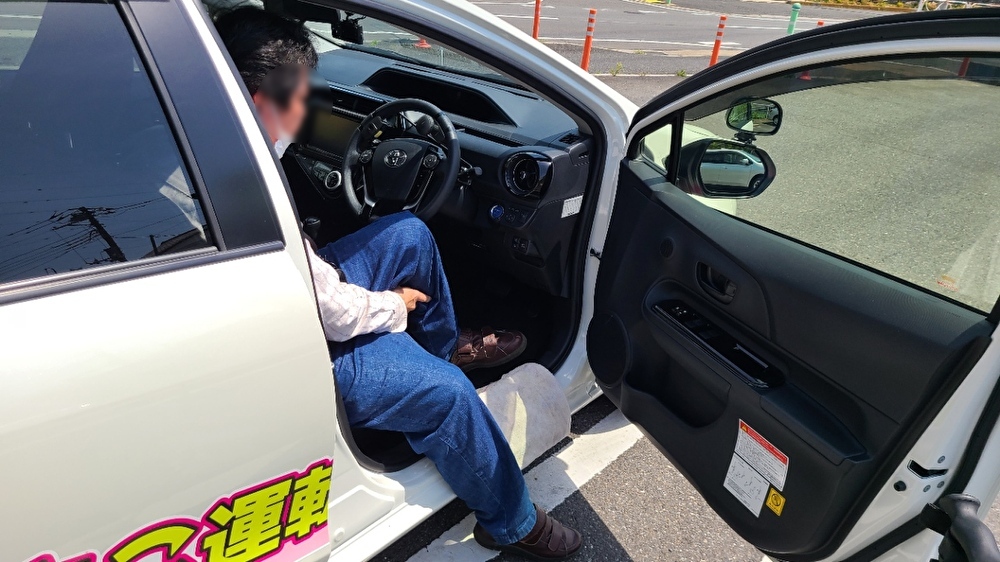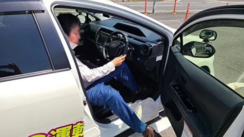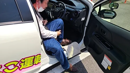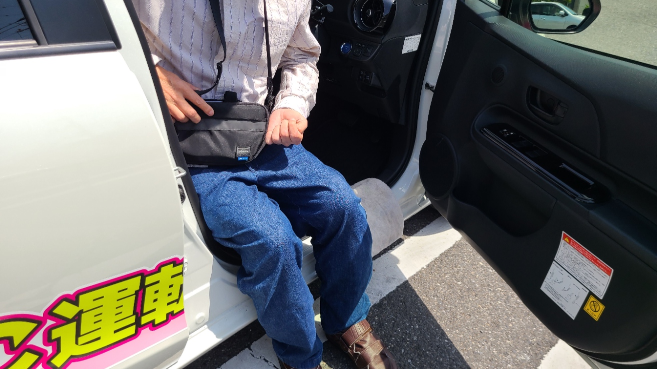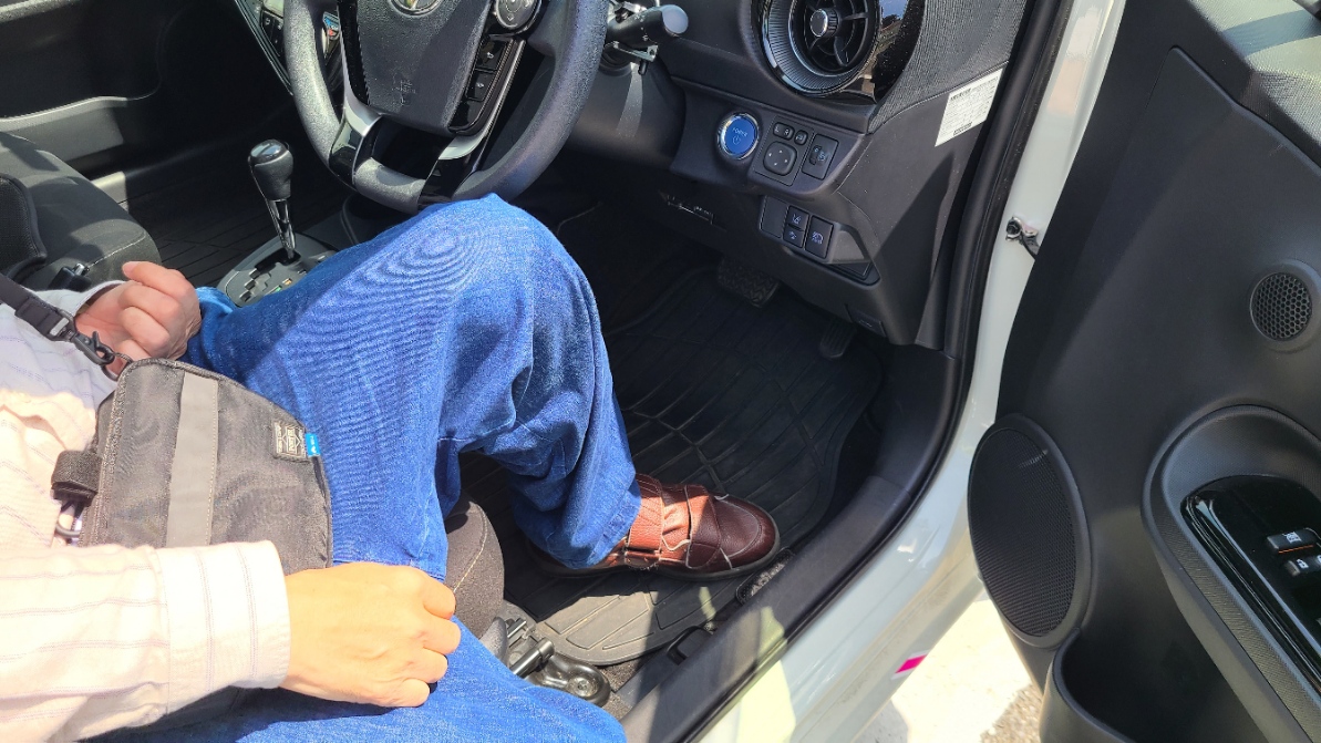 乗車時に左足がハンドルに引っかかり、ドアを開けてから閉めるまで1分弱かかることがありました。また、下肢装具が金属製の場合は、サイドシルが傷つく恐れがあるため、タオルを敷くことをおすすめします。(このように右ハンドル車では、左麻痺の方は乗り降りの際に時間がかかる傾向があります。一方で、右麻痺の方が運転席に乗り込む際、左手でドアを開ける際にバランスを崩すことがあるため注意が必要ですが、乗降自体は比較的スムーズにできることが多いです。)