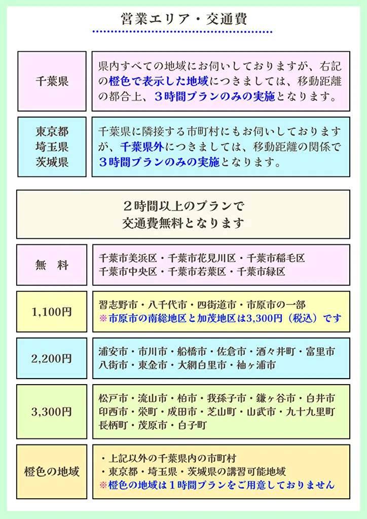 下記の料金はすべて税込みです。2 時間以上のご利用で交通費が無料となります。なお、地図の橙色エリアは 3 時間プランのみの対象地域です。