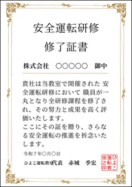 安全運転研修を修了した受講者全員に、研修修了証明書を授与します。また、企業様向けに同様の証明書を発行しております。この証明書は、監査の際や会社内での安全運転への取り組みを報告する際にご活用いただけます。社員の皆様の努力を証明すると同時に、会社全体の安全運転への姿勢を示す重要な資料としてお役立てください。