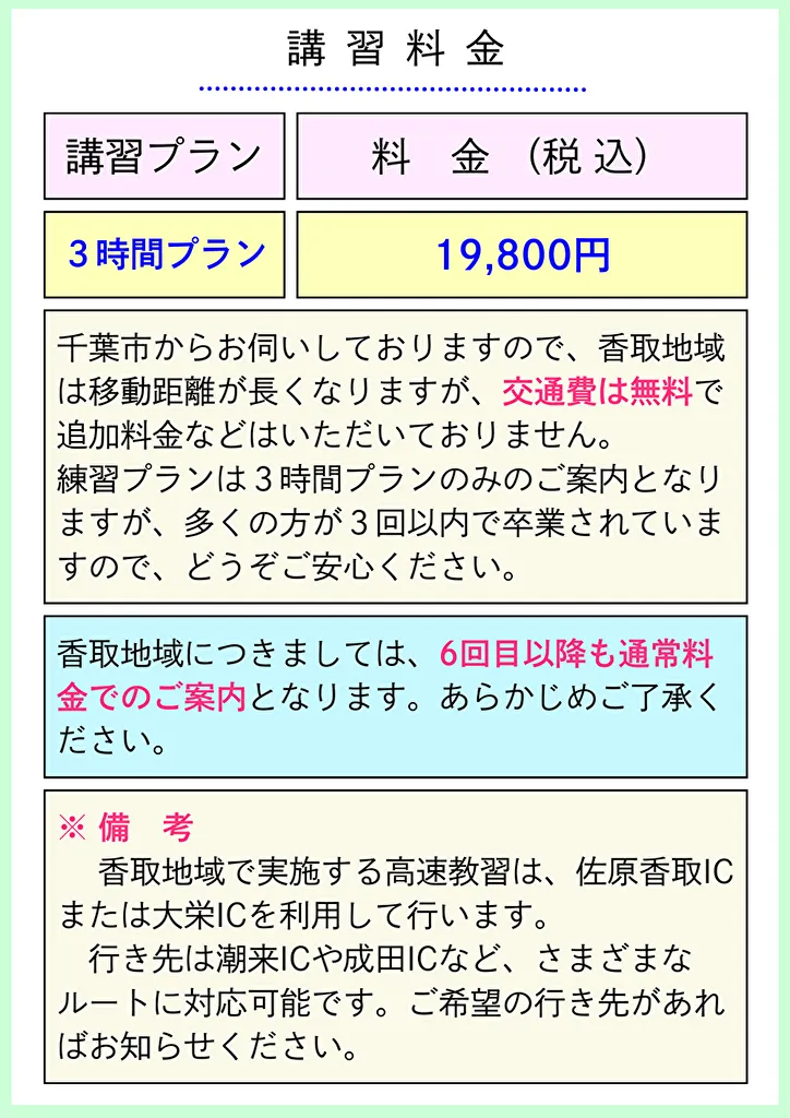 香取地域のお客様は、3時間プランをご利用のため交通費が無料になります。