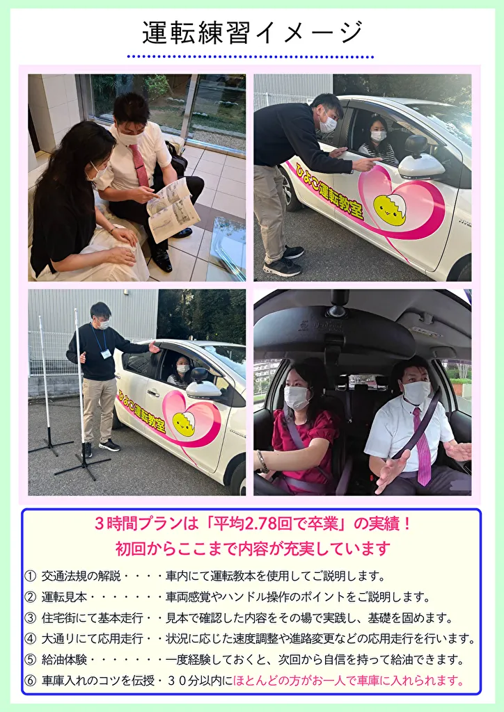 2025年の平均受講回数は、 3時間プランで2.78回(詳細は「よくある質問」に記載)で、一般道路は車庫入れを含めて約2回、高速道路を含めても約3回で恐怖心がなくなり、お一人で運転できる方がほとんどです。3時間プランはじっくり練習できるため、1回で卒業される方も多くいらっしゃいます。