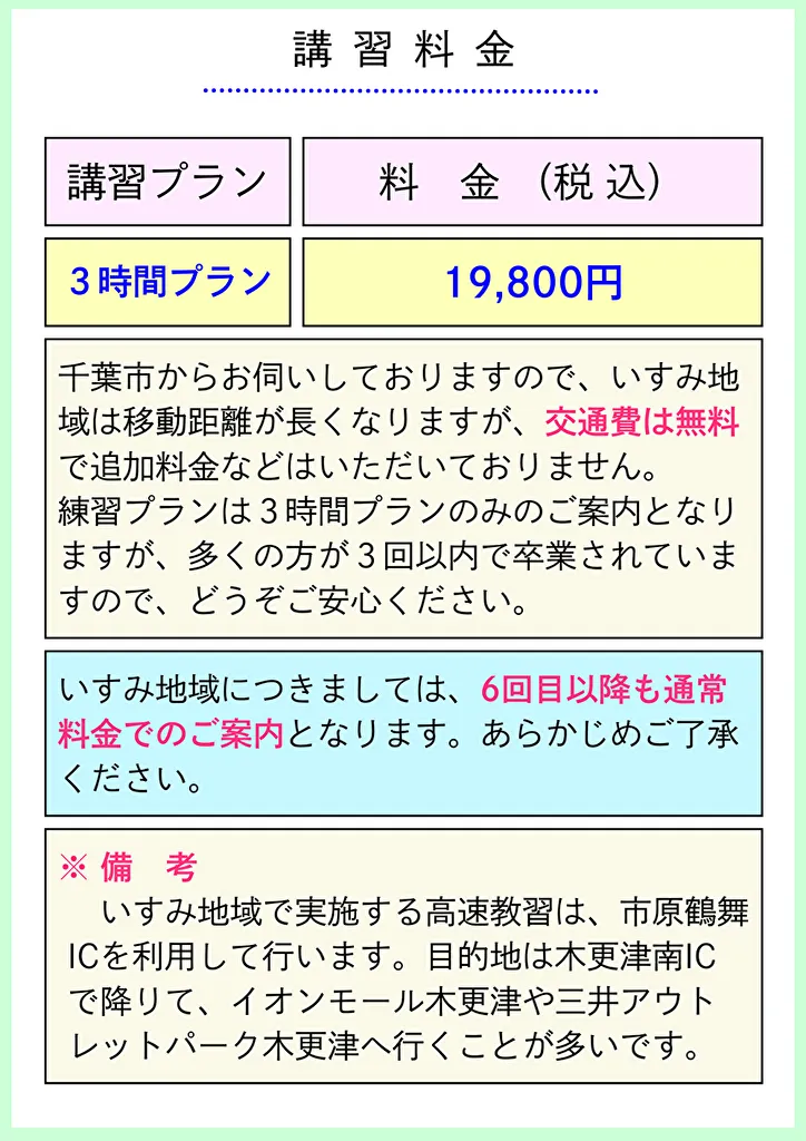 いすみ地域(いすみ市・勝浦市・大多喜町・御宿町・一宮町)につきましては、「3時間プラン(税込19,800円)交通費無料」のみのご案内となります。
