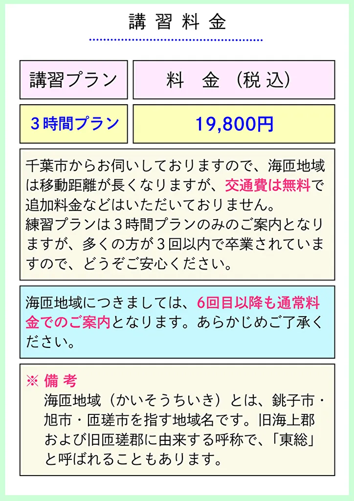 海匝地域(銚子市・旭市・匝瑳市)につきましては、「3時間プラン(税込19,800円)交通費無料」のみのご案内となります。